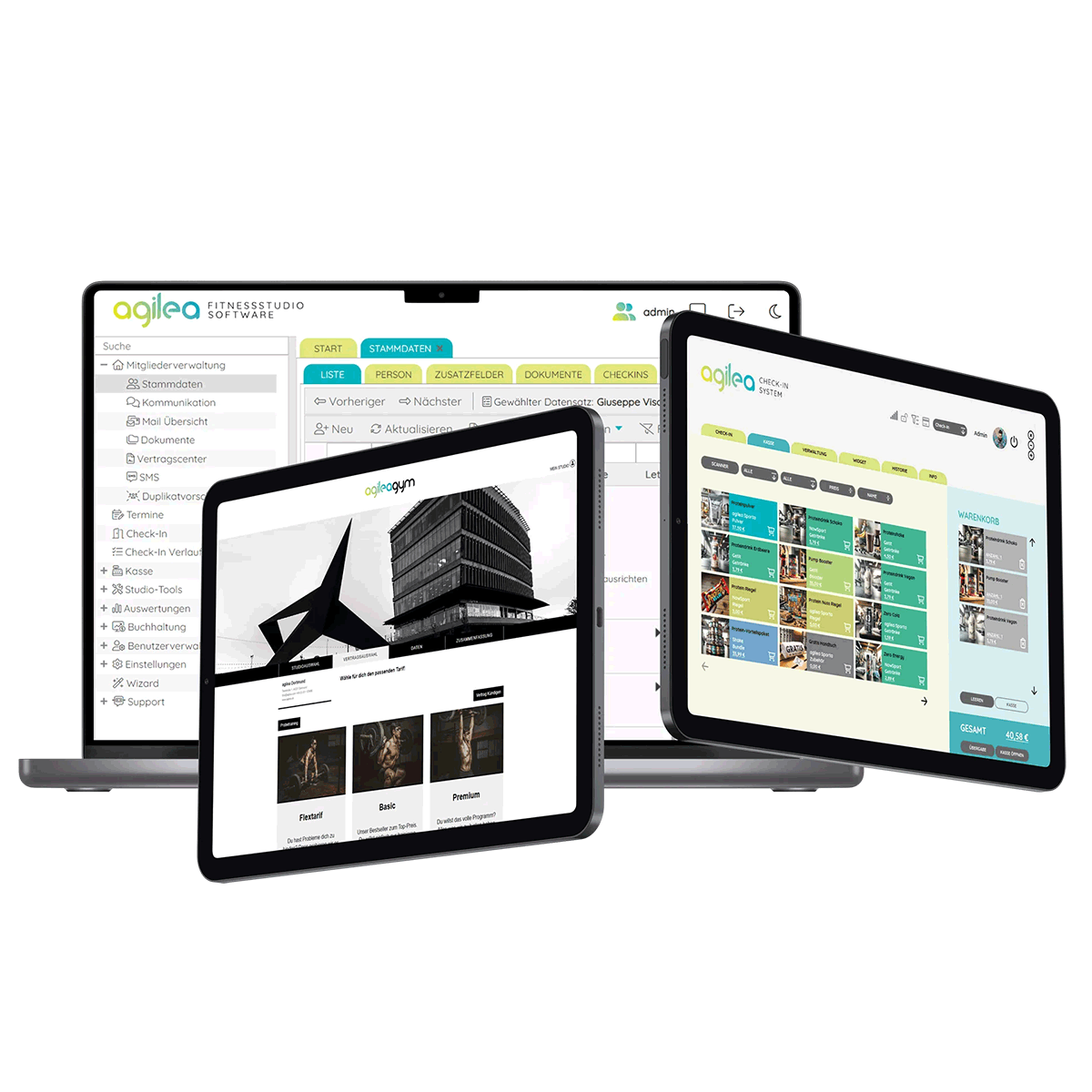 Il software per studi fitness agilea, basato su cloud, offre una gestione intelligente del vostro studio. Dalla creazione e gestione dei soci al check-in e alla fatturazione, tutto è riunito in un'unica piattaforma intelligente. Grazie all'integrazione di wallee, potete offrire ai vostri iscritti moderni metodi di pagamento in loco (terminali wallee) e online.